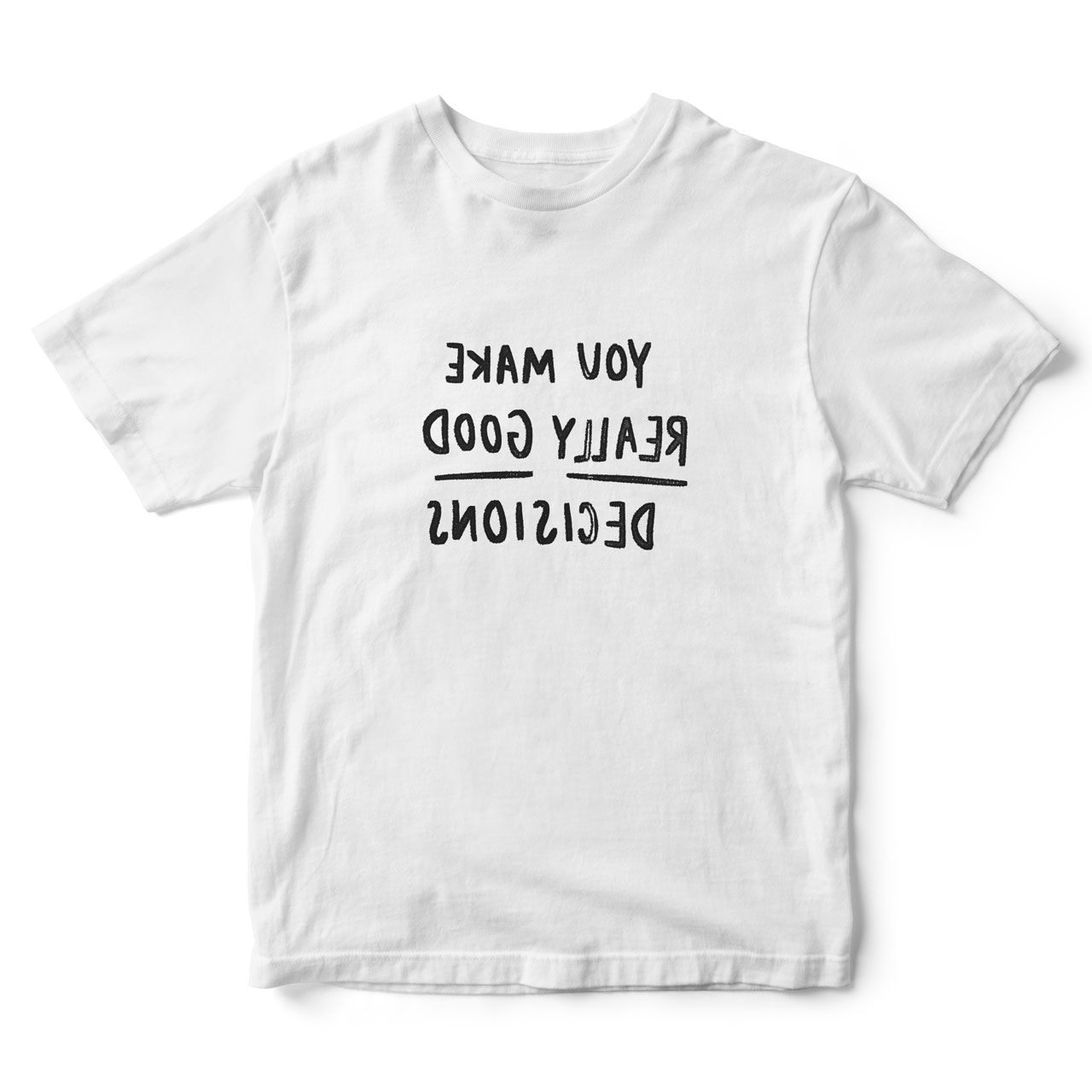 We all suffer from imposter syndrome. These ego boost tee shirts actually probably won’t help, but hey — it’s worth a shot! Backwards type makes them legible every time you look sorrowfully into a mirror.